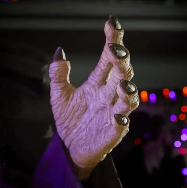 Foot hovering witch animatronic adds spookiness during the Halloween festivities.